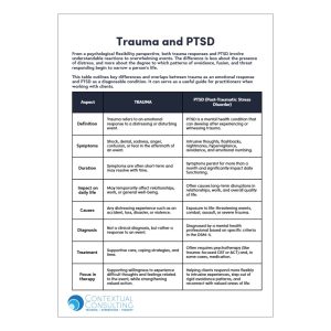 This handout outlines key differences and overlaps between trauma as an emotional response and PTSD as a diagnosable condition. It can serve as a useful reminder for practitioners when working with clients.